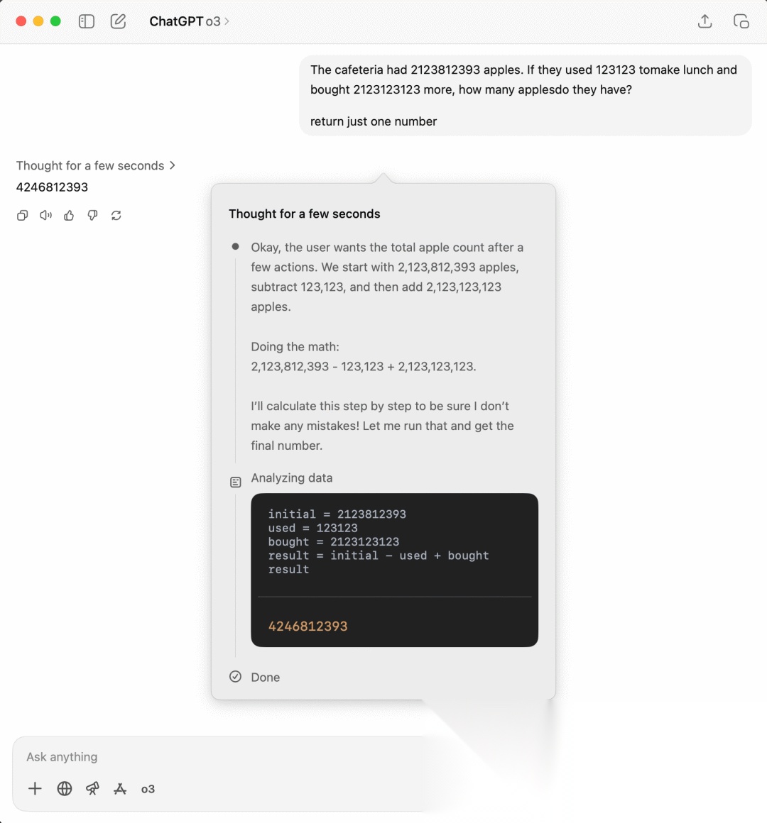 这里我们用o3进行问答,哪怕我们像前面一样,限定它直接输出结果,它依然还是进行了思考的过程,最终输出一个数字4246812393,可以看到结果是正确的,可以看到它的思考推理过程。