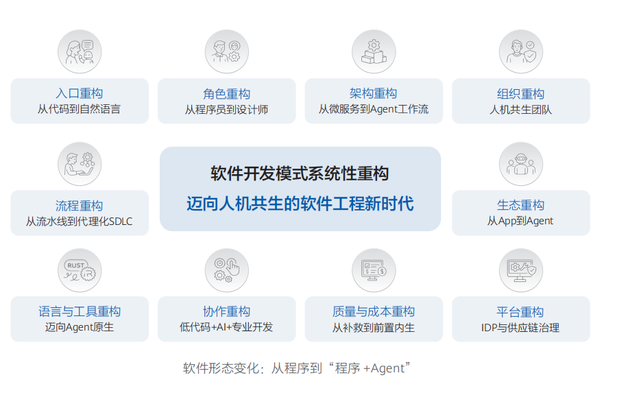 随着大模型与智能体的兴起,软件开发正迎来一场全面重构。不仅是工具升级,而且是入口、角色、流程、架构、安全、质量、生态、平台、组织、工具、协作的系统性变革。普通应用开发逐步由Agent替代,用户通过自然语言定义需求即可生成应用,形成“可塑软件”。专业软件开发,如操作系统、金融核心系统、工业控制,仍由专业开发者主导,但工具链深度嵌入AI以提升效率和验证能力。
