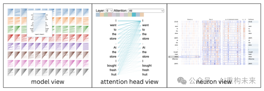 备注: BertViz 在多个尺度上可视化注意力,包括模型级别、注意力头部级别和神经元层