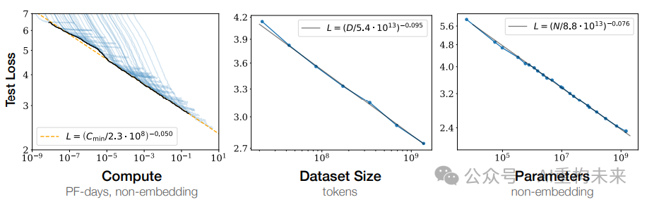 3)缩放定律(Scaling Laws):巨人的力量与挑战:如果说熵能够帮助模型应对不确定性,那么缩放定律****(Scaling Laws)*则能够释放其真正的潜力,描述了AI系统的性能如何随着训练数据、模型参数或计算资源大小的增加而提高。 “越大越好”这句话听起来可能有些简单,但在大语言模型的世界里,这句话通常是正确的。参数、数据和计算方面的扩展已被证明是解锁我们曾经认为不可能实现的能力的关键。具体如下:随着模型规模*、数据集大小以及用于训练的计算量²的增加,语言建模的性能会平稳提升。为了获得最佳性能,这三个因素必须同步扩展。当不受其他两个因素限制时,实证结果显示,性能与每一个因素之间都呈现幂律关系。
