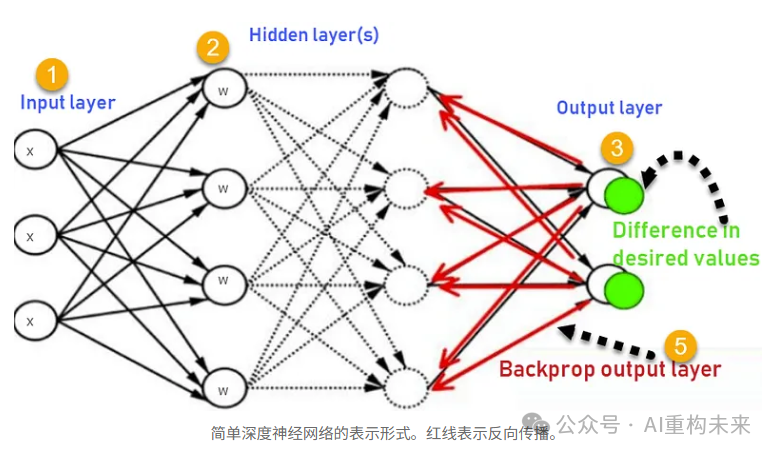 这个过程之所以变得实用,要归功于20世纪80年代的一个革命性想法:反向传播(Backpropagation)。AI教父杰弗里·辛顿(Geoffrey Hinton)和大卫·鲁梅尔哈特(David Rumelhart)和 罗纳德·威廉姆斯(Ronald Williams)等开发的该方法允许通过将误差从输出层向后传播到输入层来调整神经网络中的权重,因此称为“反向传播“。在此之前,由于难以调整隐藏层的权重,训练神经网络是一项艰巨的任务。反向传播算法通过计算误差函数关于网络权重的梯度来解决这个问题,然后可以使用该梯度在最小化误差的方向上调整权重。如今,反向传播是现代 AI 的支柱。当我们阅读具有数十亿个参数的大型语言模型时,正是反向传播使我们能够为每个参数得出适当的值。