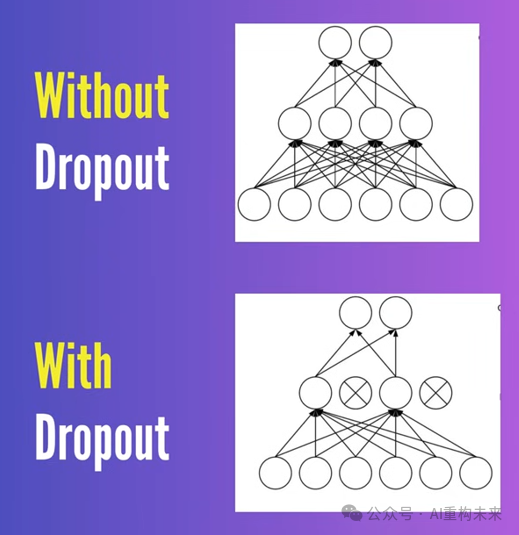 最简单、最有效的正则化技术之一是Dropout。在训练过程中,Dropout会暂时禁用网络中的随机神经元。这迫使模型学习更稳健的模式,防止其过度依赖特定路径。这就像训练一支足球队,偶尔会替换掉关键球员,确保每个成员都能适应并在压力下表现出色。