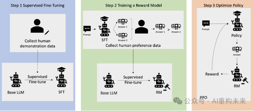 4)人类反馈强化学习(RLHF):让AI理解“人心”: 随着模型变得越来越大、越来越复杂、越来越强大,一个关键问题随之而来:我们如何使它们的输出与人类的价值观和期望相一致?我们如何确保这些系统不仅有效,而且为我们服务?这就是基于人类反馈的强化学习(RLHF)发挥作用的地方。RLHF的核心是将机器学习的优势与人类洞察力相结合。这个过程确保人工智能系统的行为与人类认为有用、合乎道德且恰当的行为相一致。但它是如何运作的呢?