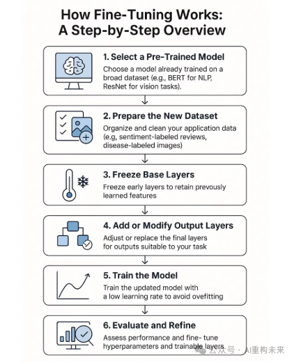 3)微调与迁移学习:从通才到专家的蜕变: 微调和迁移学习的发展代表着我们人工智能训练方式的转变。早期的模型是从零开始训练的,需要大量的数据集和计算才能建立对语言的基本理解。这个过程既耗时又耗资源。预训练(Pre-training)的出现改变了一切。研究人员发现,模型可以首先从多样化的大规模数据集中学习通用的语言模式。这个阶段称为预训练,它建立了对语言的基础理解。之后,微调(Fine-tuning)使这些预训练模型能够专注于特定任务,从而大幅减少训练所需的时间和资源。