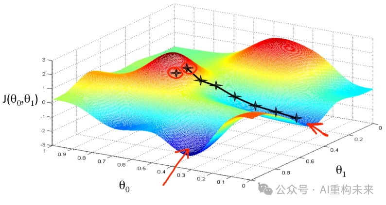 1)梯度下降与反向传播:在“迷雾山”中寻路: 想象一下,你在浓雾中下山。你看不到山峰或山谷,但你知道你的目标是找到最低点。你迈出一步,感受坡度,并根据你是下坡还是上坡来调整方向。这就是梯度下降(Gradient Descent)的本质,这个过程使模型能够学习和改进。这个过程的核心是成本函数(Cost Function)的概念,梯度下降的全部意义在于最小化成本函数,可以把它想象成一张衡量模型预测误差程度的地图。成本越高,模型距离正确答案就越远。梯度下降是模型用来调整参数(内部设置)以降低成本的方法。