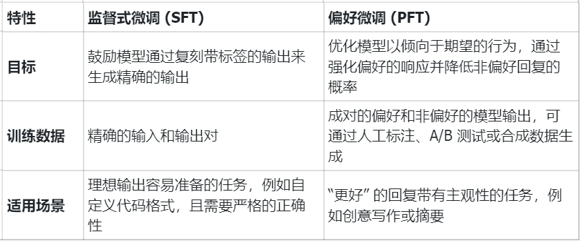 ②偏好微调 (Preference Fine-Tuning, PFT) : 采用直接偏好优化 (例如Direct Preference Optimization, DPO) 算法,通过比较不同的模型输出,让 AI 能够学习并区分 “更好” 的回复,从而在语气、风格、创造性等主观性任务上表现更出色。