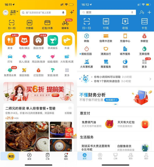 近些年,一线互联网大厂几乎对移动互联网形成了垄断,app的功能越来越多,比如下面的美团、支付宝(最近相继因为垄断问题被调查(手动狗头)):