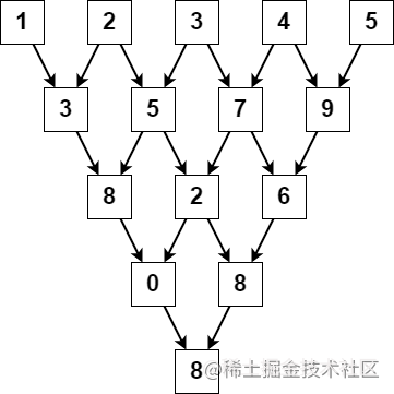 题目要求 nums[i] 要与该元素的后一个元素相加(如果有的话),将所有相加后对 10 取余的值存进新数组中并替代 nums 数组。然后继续以同样的操作遍历这个新数组,直到生成新数组的长度变为 1 后,此时不用继续遍历,返回该元素值即可。