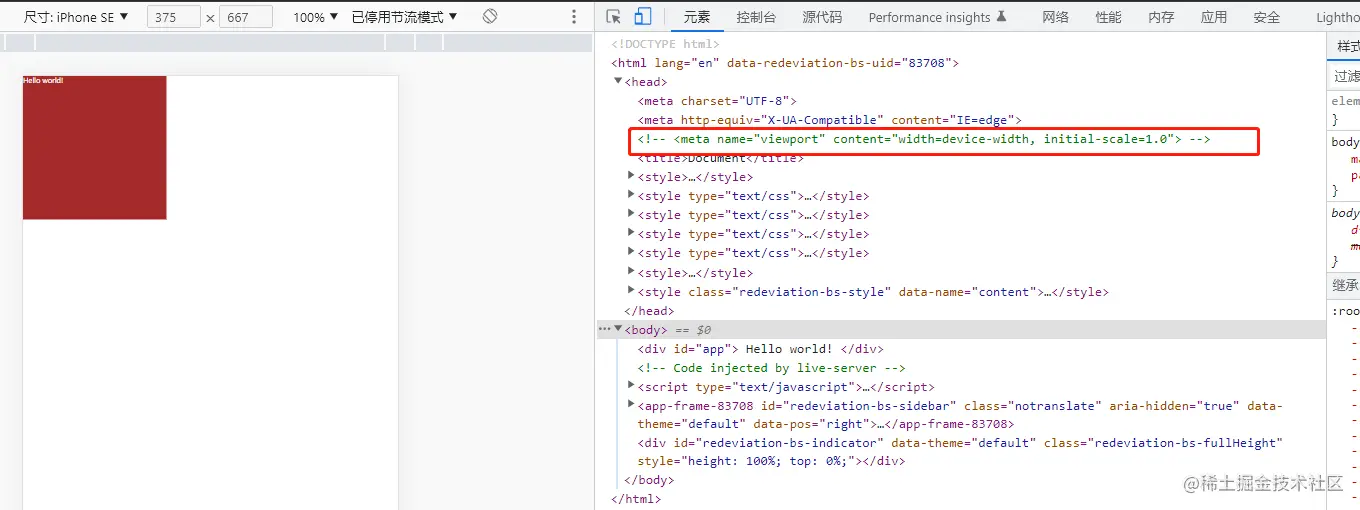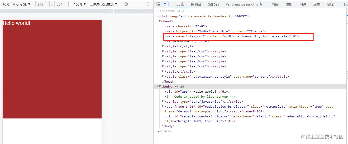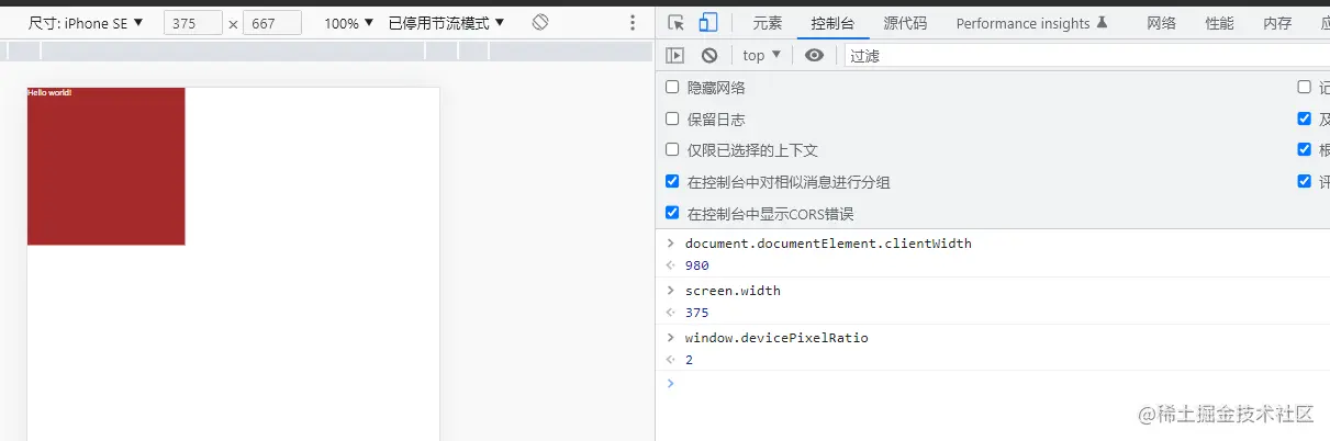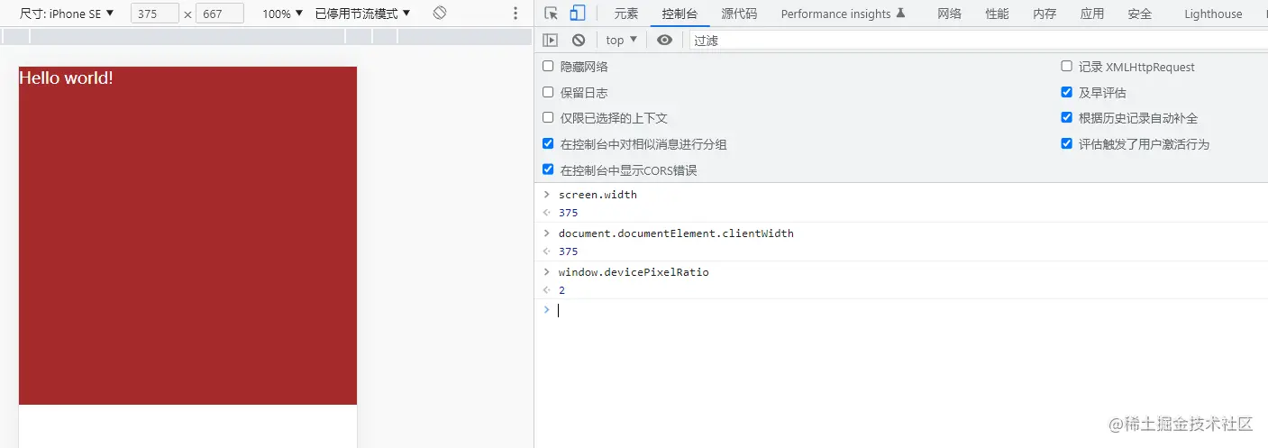 这里 width 属性指的是布局视口宽度,现在布局视口的宽度被设置为了设备的屏幕宽度,也就是布局视口=视觉视口,即文档视口宽度大小与设备宽度大小 100% 对应(转换为 CSS 像素值相同),现在理想视口就实现了。