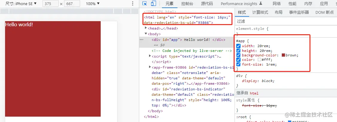 #app {width: 375px;height: 200px;background-color: brown;color: #fff;font-size: 16px;