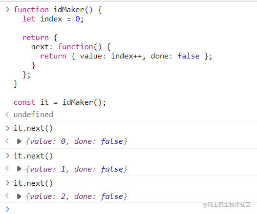 function idMaker() {let index = 0;return {next: function() {return { value: index++, done: false };}};