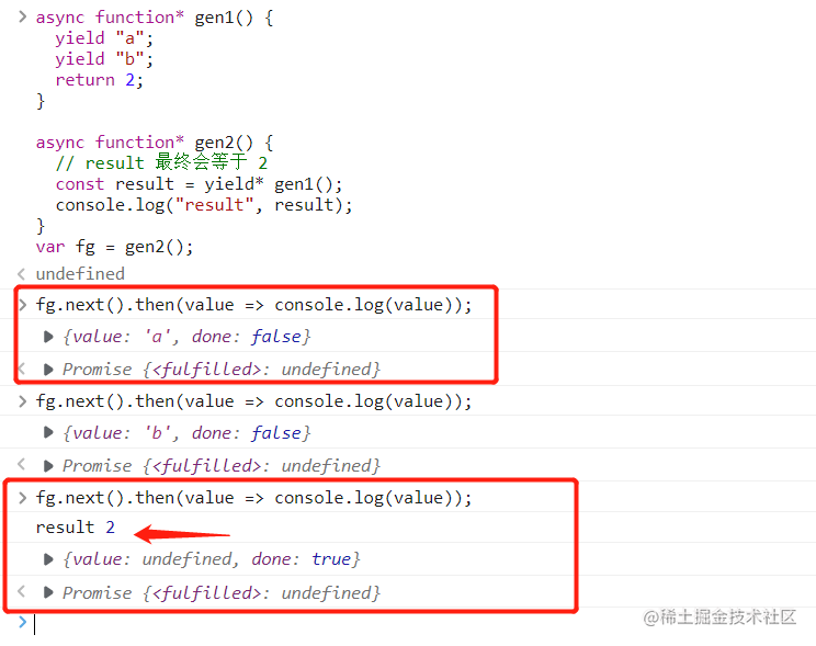 async function* gen2() {// result 最终会等于 2const result = yield* gen1();