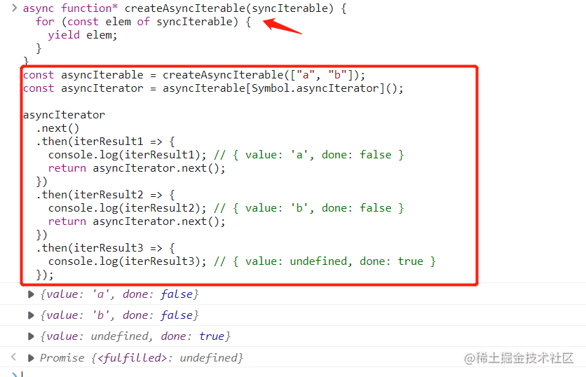 .then(iterResult2 => {console.log(iterResult2); // { value: 'b', done: false }return asyncIterator.next();