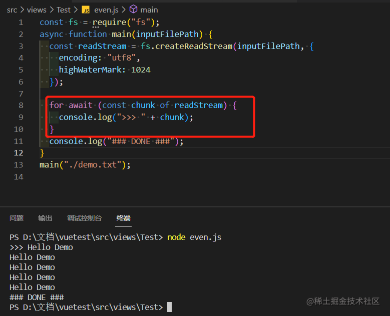 async function main(inputFilePath) {const readStream = fs.createReadStream(inputFilePath,{ encoding: 'utf8', highWaterMark: 1024 });for await (const chunk of readStream) {console.log('>>> '+chunk);}console.log('### DONE ###');