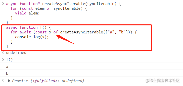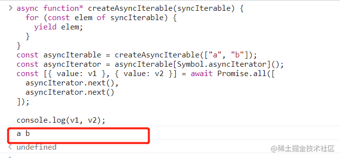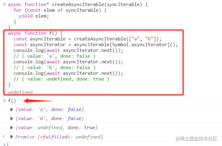 async function f() {const asyncIterable = createAsyncIterable(['a', 'b']);const asyncIterator = asyncIterable[Symbol.asyncIterator]();console.log(await asyncIterator.next());// { value: 'a', done: false }console.log(await asyncIterator.next());// { value: 'b', done: false }console.log(await asyncIterator.next());// { value: undefined, done: true }