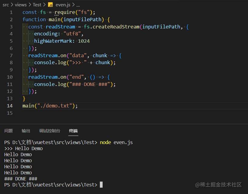 function main(inputFilePath) {const readStream = fs.createReadStream(inputFilePath,{ encoding: 'utf8', highWaterMark: 1024 });readStream.on('data', (chunk) => {console.log('>>> '+chunk);});readStream.on('end', () => {console.log('### DONE ###');});