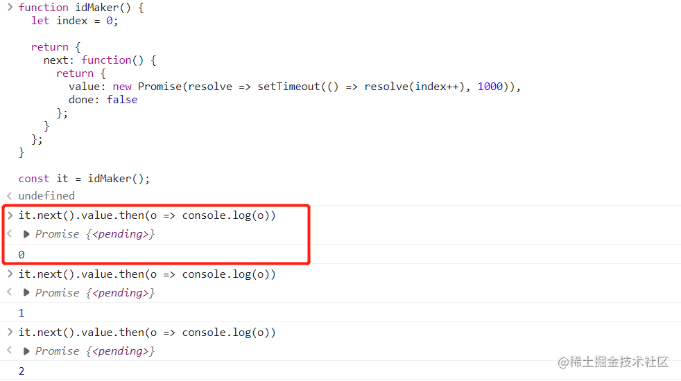 it.next().value.then(o => console.log(o)) // 0