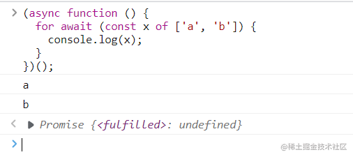 (async function () {for await (const x of ['a', 'b']) {console.log(x);}