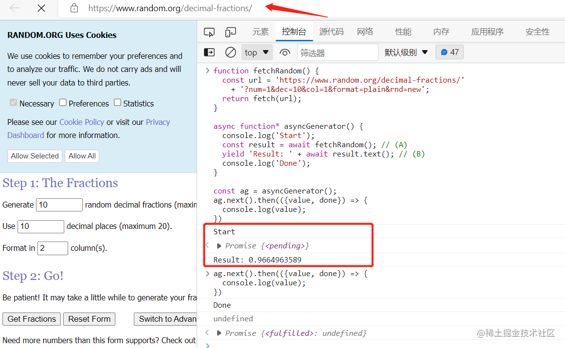 async function* asyncGenerator() {console.log('Start');const result = await fetchRandom(); // (A)yield 'Result: ' + await result.text(); // (B)console.log('Done');