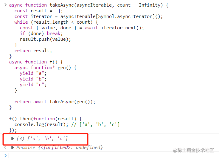 async function f() {async function* gen() {yield 'a';yield 'b';yield 'c';}return await takeAsync(gen());