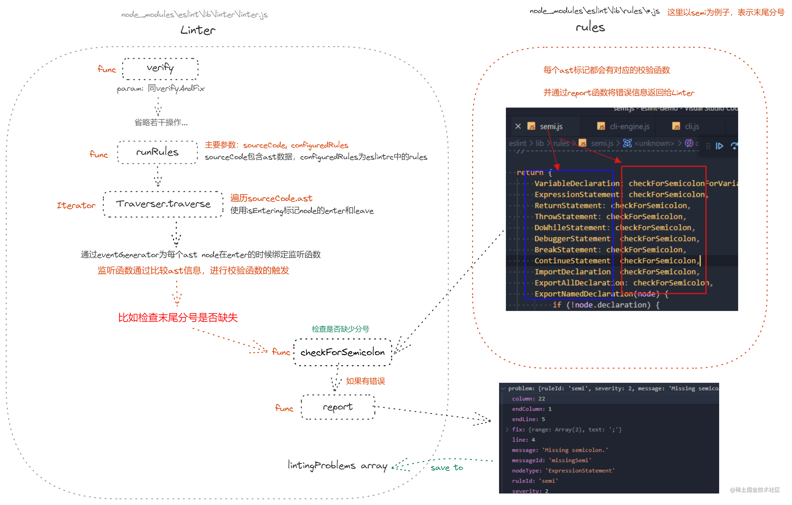 通过调用runRules函数,并执行Traverser.traverse遍历ast tree, 并调用相应的检测函数进行校验,输出问题信息