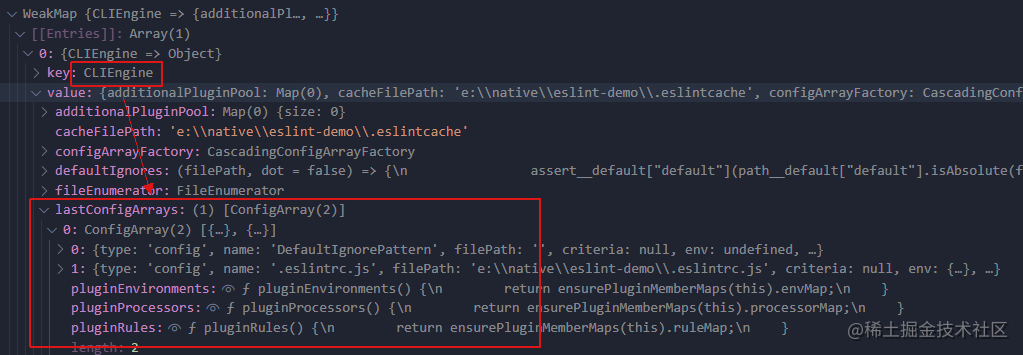 eslint demo(字符串这里选择单引号规则)mkdir eslint-demo & cd eslint-demo npm init -ynpm init @eslint/config# 选择js特性即可,字符串请选择单引号规则mkdir src & echo > src/index.js'const a = "hello";'* 配置package.json,修改`script````{ “name”: “eslint-demo”, “version”: “1.0.0”, “main”: “index.js”, “scripts”: { “test”: “npx eslint index.js” }, “devDependencies”: { “eslint”: “^8.27.0” }}* 配置launch.json (后续打断点,按F5即可调试)mkdir .vscode & touch launch.json**launch.json**{“version”: “0.2.0”,“configurations”: [{“name”: “Launch via NPM”,“request”: “launch”,“runtimeArgs”: [“run-script”,“test”],“runtimeExecutable”: “npm”,“skipFiles”: [“<node_internals>/**”],“type”: “node”}]}* 进入node\_modules/eslint/bin/eslint.js找到以下代码所在行,打个断点,按F5即可开启调试require(“…/lib/cli”).execute ```文件遍历以及文件配置生成过程