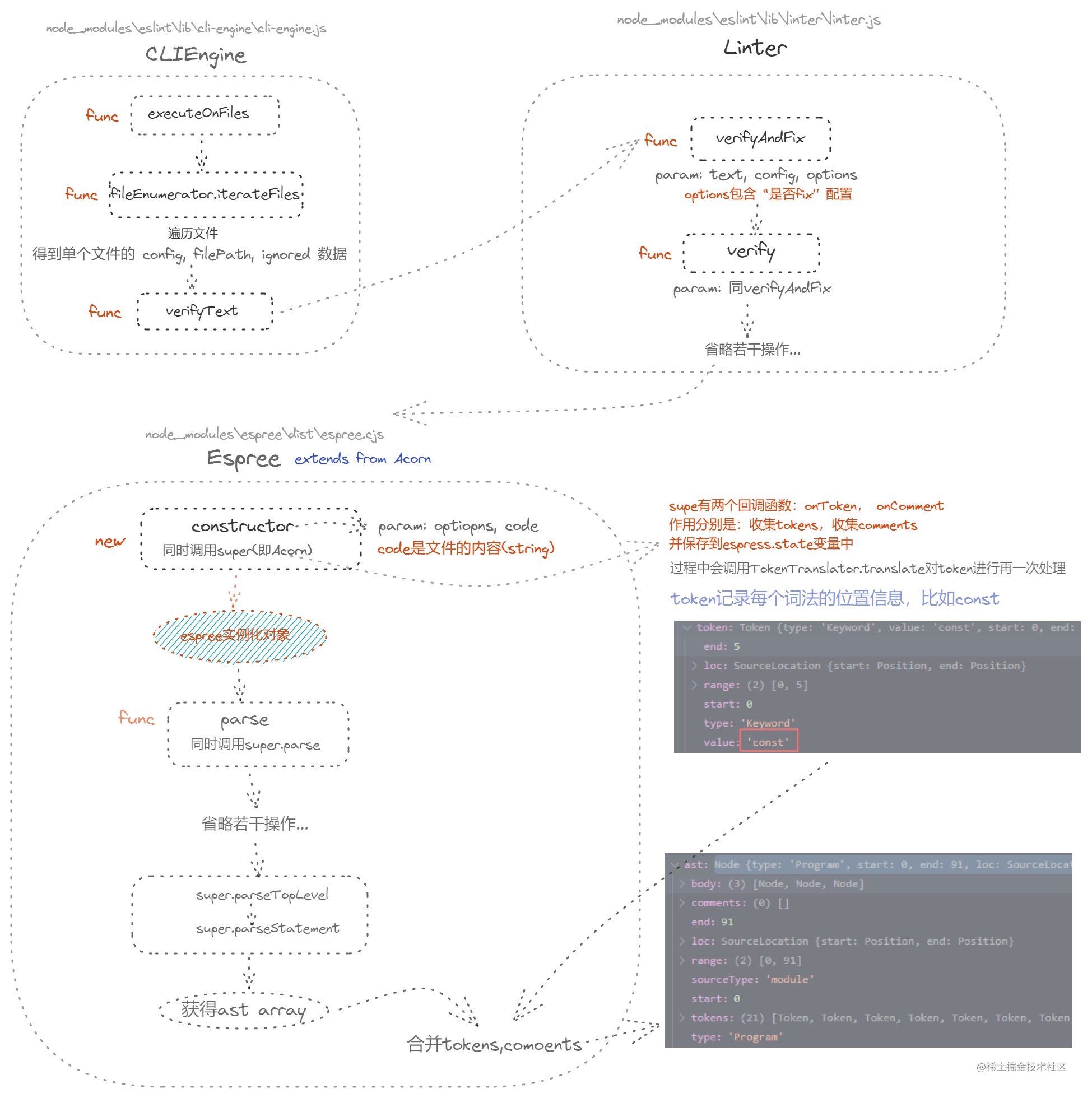 FileEnumerator遍历每个文件,并为文件绑定config路径: node_modules\eslint\lib\cli-engine\file-enumerator.js* Linter 该类是 Eslint 的执行总裁,配置文件加载、校验、修复都是该类来控制完成的路径: node_modules\eslint\lib\linter\linter.js* espree> espree是基于Acorn实现的> > 源码位置:node_modules\espree\dist\espree.cjs ->class Espree extends Parser``Eslint使用它将代码转成ast,核心方法espree.parse,路径:node_modules\espree\dist\espree.cjs在Linter类的初始化过程中会将espree缓存到internalSlotsMap全局对象中,后续verify环节会使用