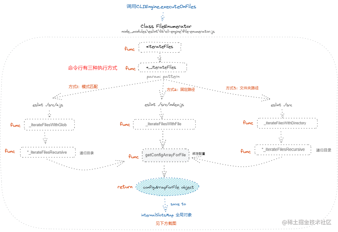 从入口CLIEngine.executeOnFiles调用fileEnumerator.iterateFiles实现文件的遍历和配置生成,其中patterns为命令行传入的文件范围,它可以传一个固定的路径或者模式匹配,具体过程见下图: