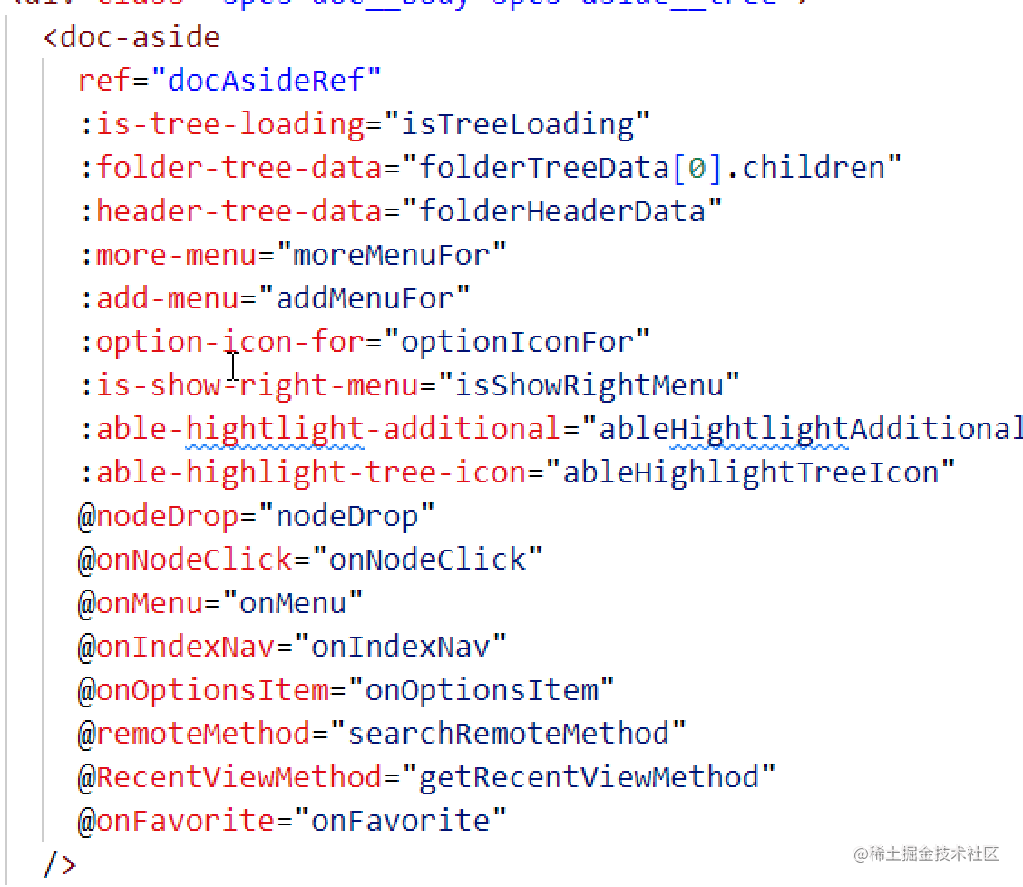 随后将controller中公共方法都传进到组件当中. doc-aside是包括search和tree已经other三个模块的中转组件. 不在这个组件中做任何的逻辑处理. 如下图: