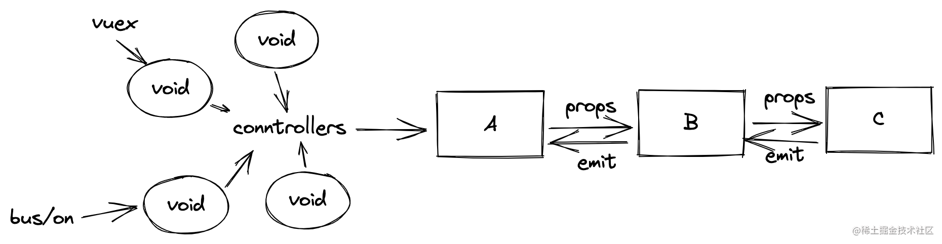 依旧是A B C 三个组件.但是A B C三个组件外边飘的那些箭头不存在了. 所有能够控制它们的内部状态的方式都集中 在了controllers上面.