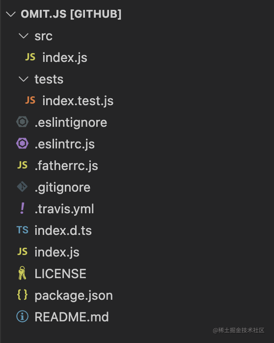 从 omit.js 目录可以看出个大概,项目依赖 eslint、father、Travis CI,内置 TS 类型声明 index.d.ts,关键还是看 package.json