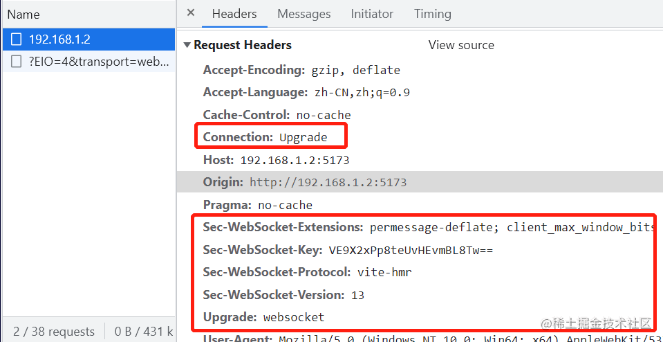 HTTP 1.1中用Upgrade标头可用于将已建立的客户端/服务器连接升级到不同的协议(通过相同的传输协议)* 例如,客户端可以使用它来将连接从HTTP 1.1升级到HTTP 2.0,或者将HTTP或HTTPS连接升级到WebSocket* 而在HTTP/2中是被明确禁止使用这种机制/标头 - Sec-WebSocket-Key* 是由浏览器随机生成的一个