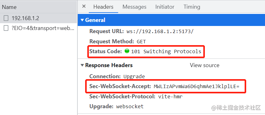 websocket协议,那么服务端就会返回状态码为101且带有响应头Sec-WebSocket-Accept的消息给客户端* Status Code: 101 表示指服务器将按照请求头信息变为一个不同的协议,是HTTP 1.1中新加入的* Sec-WebSocket-Accept 中存放的是在请求头Sec-WebSocket-Key中经过特定加密算法得到的结果