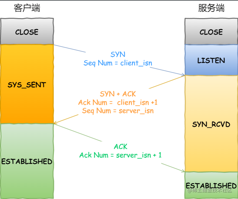 从上述内容可以知道,HTTP 和 WebSocket 都是基于 TCP 的,因此建立连接的过程肯定少不了大家熟知的 TCP 三次握手,关于这部分在早前的 重新认识 TCP 三次握⼿和四次挥⼿ 一文中有过相关的介绍,这里不过多阐述。