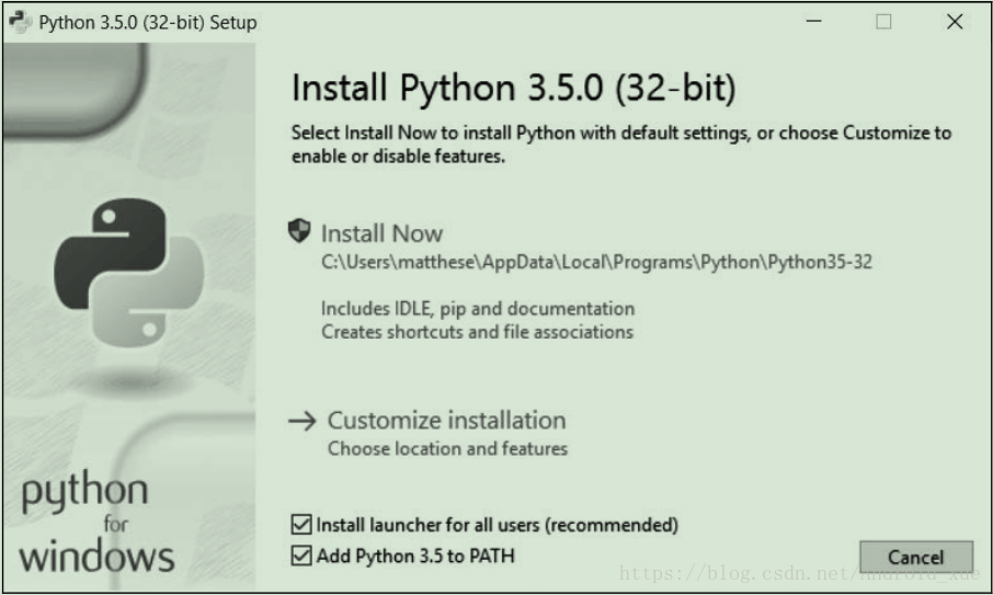 你的系统自动下载正确的安装程序。下载安装程序后,运行它。请务必选中复选框Add Python to