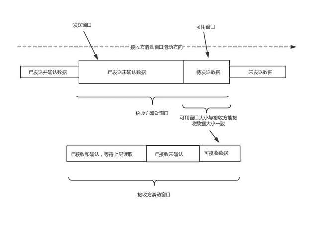 在发送方的滑动窗口中,可分为发送窗口和可用窗口。发送窗口中的数据已发送接收方,但未接到接收方的确认;可用窗口则表示发送方还可以发送多少数据。发送方的窗口大小会受到接收方窗口的改变而改变。