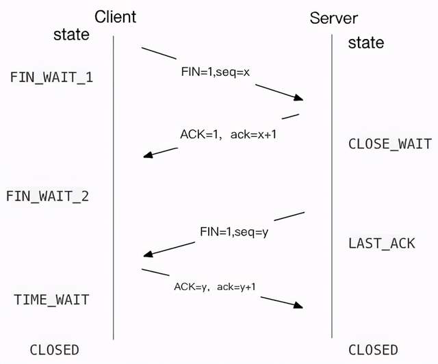 第四次挥手:客户端收到请求包后,发送ACK=1,ack=y+1的确认包给服务端,并进入TIME_WAIT状态,有可能要重传确认包。服务端收到确认包后,进入CLOSED状态,服务端到客户端的连接已断开。客户端等到一段时间后也会进入CLOSED状态。