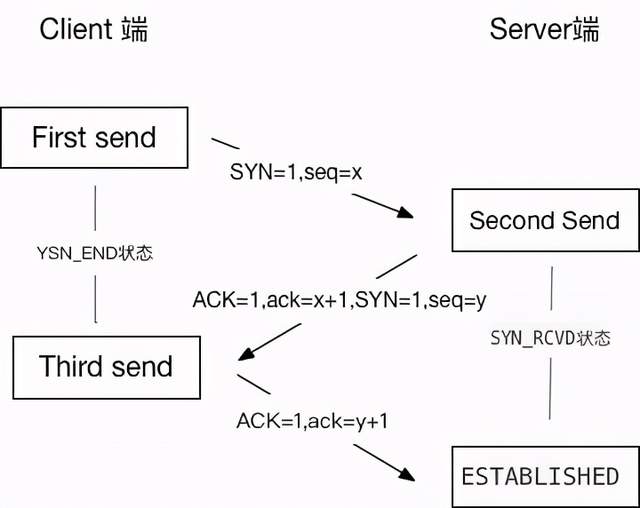第一次:客户端发送连接请求报文给服务端,其中SYN=1,seq=x。发送完毕后进入SYN_END状态。