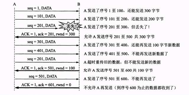 接收方数据被上层读取后,又可以接收序号为501-600共100个字节,所以通知A,接收窗口大小为100,序号为501开头....在上图的整个过程中,A共收到B三次流量控制。