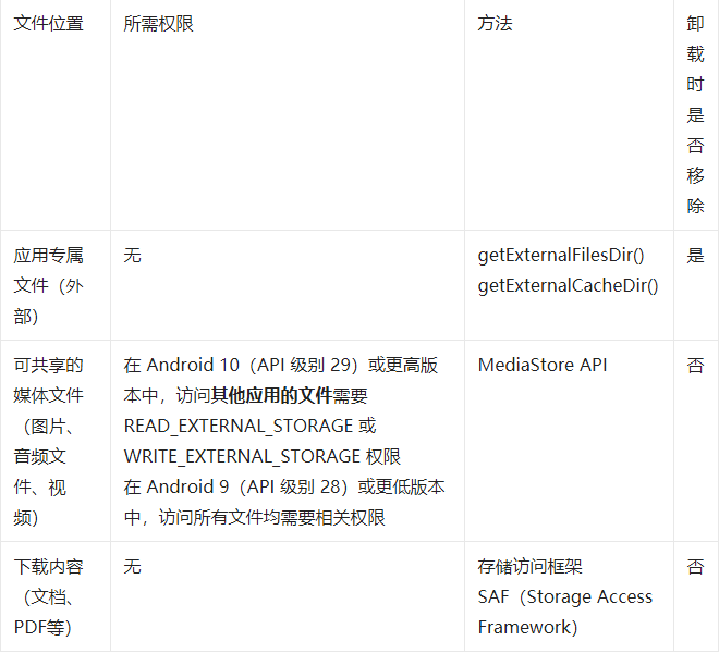 为了让用户更好地管理自己的文件并减少混乱,以 Android 10(API 级别 29)及更高版本为目标平台的应用在默认情况下被赋予了对外部存储空间的分区访问权限,即分区存储。此类应用在不请求任何与存储相关的用户权限时,只能访问外部存储空间上的应用专属目录,以及本应用所创建的特定类型的媒体文件。