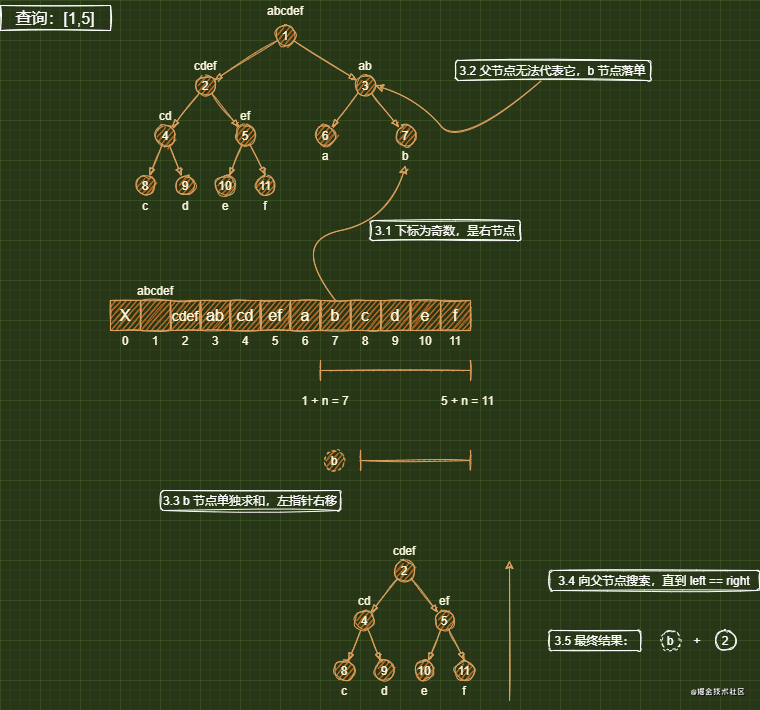 1、一开始的区间查询等同于线段树数组 [n,2n−1][n,2n-1][n,2n−1] 之间的若干个叶子节点 [left,right][left,right][left,right] 的合并,我们需要向上一层寻找能够代表这些节点的父节点;