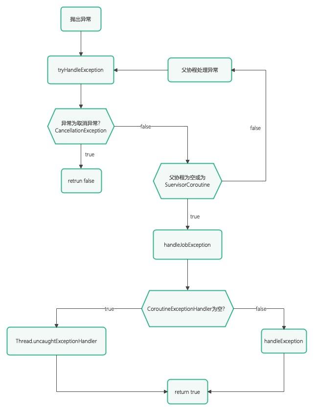 supervisorScope,如果是则调用handleJobException,处理异常 - 如果不是则将异常传递给父协程,然后父协程再进行一遍上面的流程
