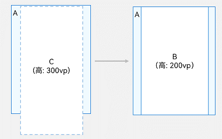 如下图所示,同样是没有设置高度的垂直列表B,其父组件A高度为200vp,若其所有子组件C的高度总和为300vp,则此时列表B的高度为200vp。