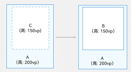 如下图所示,一个垂直列表B没有设置高度时,其父组件A高度为200vp,若其所有子组件C的高度总和为150vp,则此时列表B的高度为150vp。