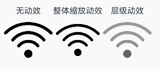 Row() { Column() { Text("无动效") Text() { SymbolSpan($r('sys.symbol.ohos_wifi')) .fontSize(96) .effectStrategy(SymbolEffectStrategy.NONE) } } Column() { Text("整体缩放动效") Text() { SymbolSpan($r('sys.symbol.ohos_wifi')) .fontSize(96) .effectStrategy(SymbolEffectStrategy.SCALE) } } Column() { Text("层级动效") Text() { SymbolSpan($r('sys.symbol.ohos_wifi')) .fontSize(96) .effectStrategy(SymbolEffectStrategy.HIERARCHICAL) } } }