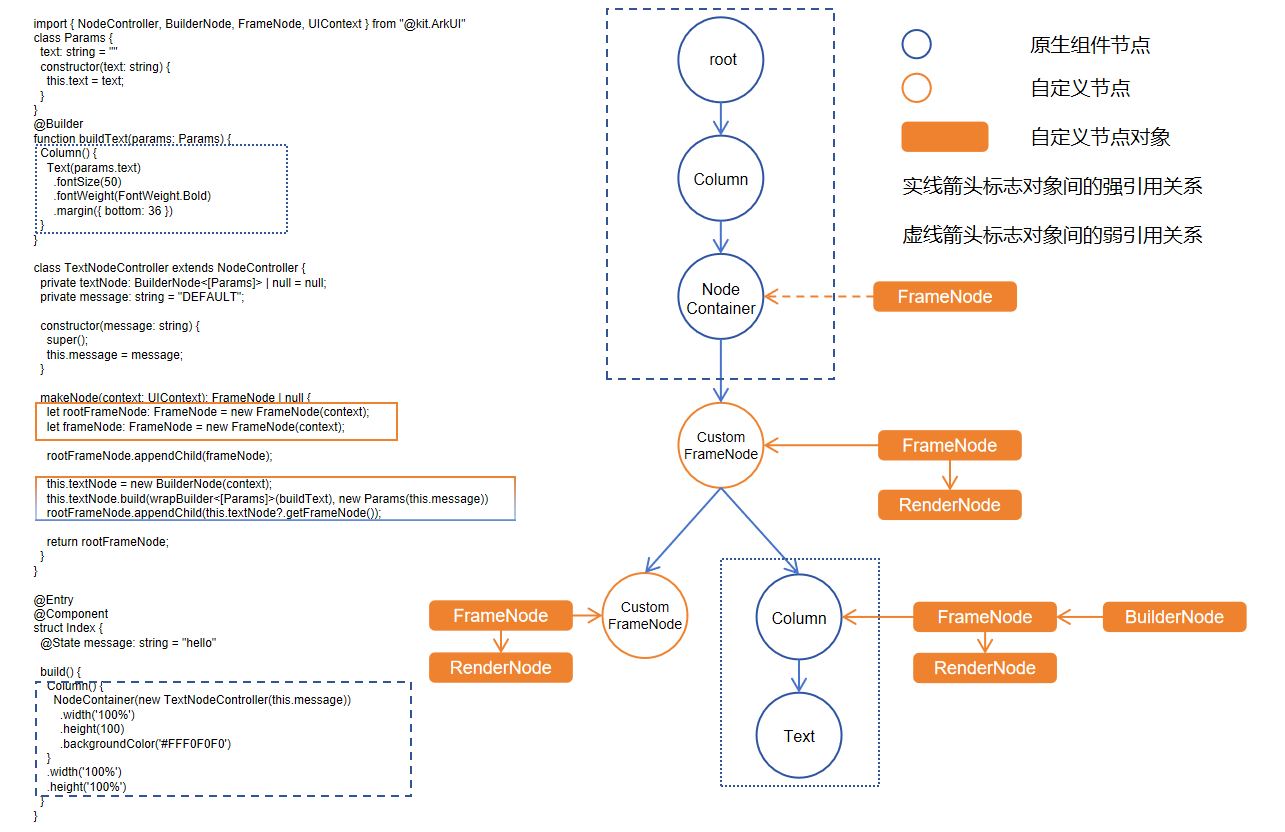 BuilderNode创建的ArkTS原生控件树支持与自定义节点(例如:FrameNode、RenderNode)进行关联使用,实现了原生组件与自定义节点的混合显示。对于使用自定义节点的能力进行对接的三方框架,BuilderNode为其提供了嵌入原生组件的能力。