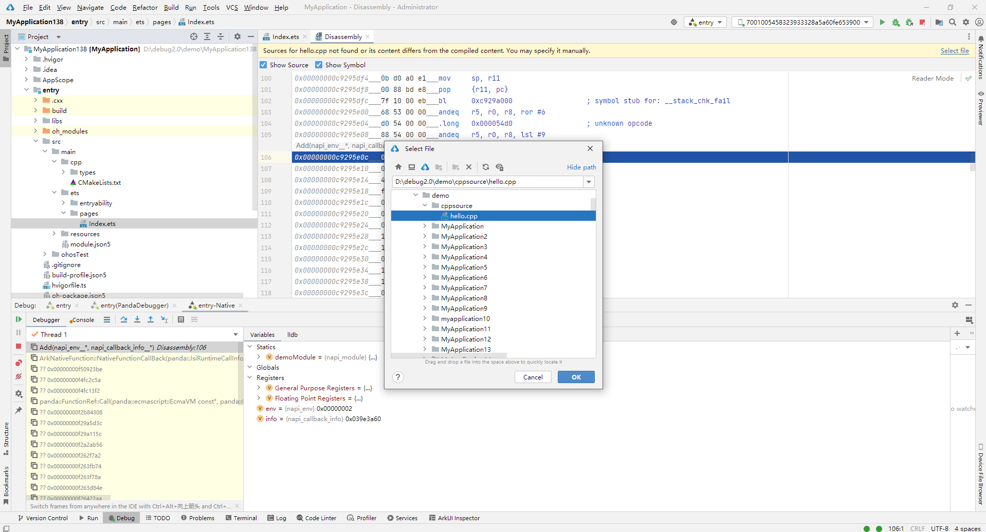 建立文件间映射关系:参考三方源码调试,当Step Into进入汇编代码后,会弹出源码关联的提示,请点击“Select file”,选择本地对应C++源码进行关联。