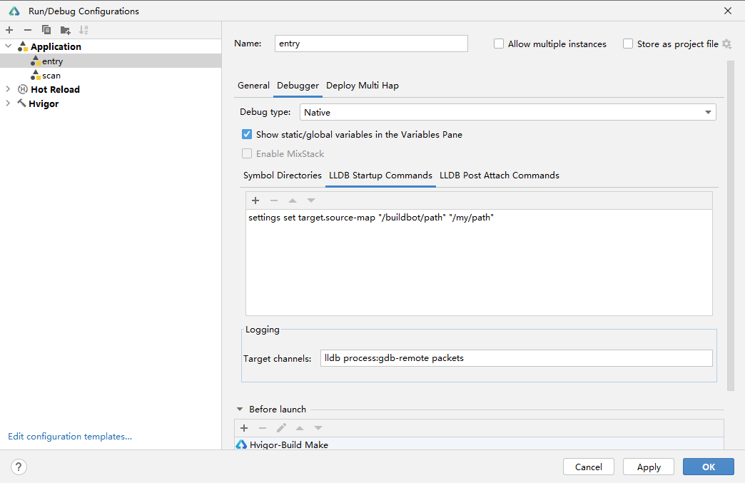建议路径间映射关系:选择Run > Edit Configurations,选择模块后,切换到Debugger页签,选择Native类型,在LLDB Startup Commands页签中,新增“settings set target.source-map "/buildbot/path" "/my/path"”命令建立映射关系,其中参数一为编译环境中的源码路径,参数二为本地源码路径。
