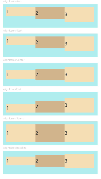 | alignItems | ItemAlign | 否 | 所有子组件在Flex容器交叉轴上的对齐格式。 默认值: ItemAlign.Start 卡片能力: 从API version 9开始,该接口支持在ArkTS卡片中使用。 |