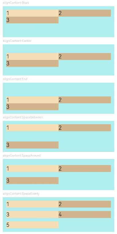 该示例通过设置alignContent实现多行内容的不同对齐效果。